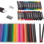 Drvene bojice, uljni pastele, olovke, gumica i šiljilo za precizno crtanje, sjenčanje i izražajne kolorirane plohe.