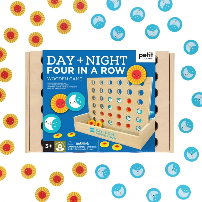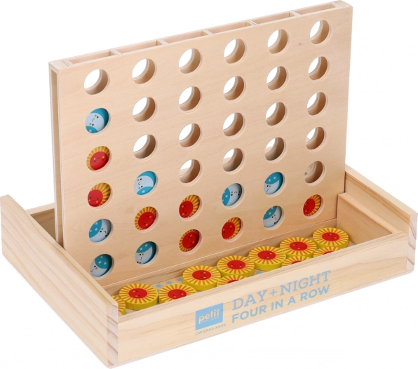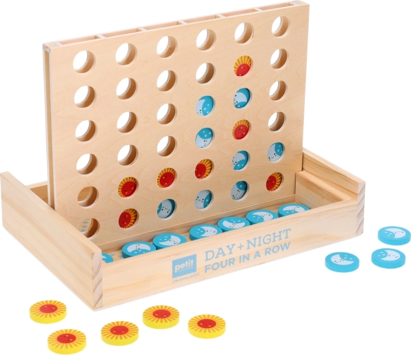 Drvena igra četiri u nizu dan i noć zahtijeva od igrača ne samo brzo razmišljanje, već i sposobnost strateškog planiranja. Cilj je postaviti četiri žetona zaredom na mrežu. Žetoni imaju atraktivan sunce i mjesec dizajn koji privlači i veseli male i velike igrače.