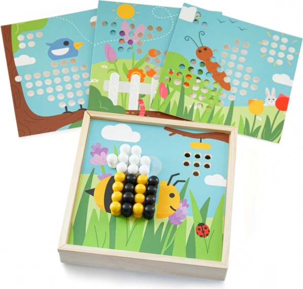 Kreativna drvena mozaička slagalica za djecu od 3 godine razvija finu motoriku, prepoznavanje boja i koncentraciju. Sadrži 4 slike i 96 klinčića u 8 boja koji se slažu na poklopac praktične kutijice – idealno za dom i za putovanja. Izrađeno od kvalitetnog, odgovorno dobivenog drva s ugodnom površinom za prirodnu taktilnu stimulaciju.