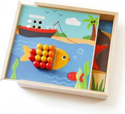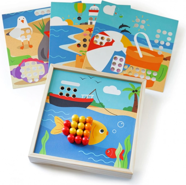 Otkrijte zabavnu mozaičku s motivima plaže koja razvija dječju maštu i vještine. Sadrži 4 slike i 96 čepića u 8 boja koje djeca slažu na poklopac praktične kutije. Igra potiče prepoznavanje boja, finu motoriku, koncentraciju i logičko razmišljanje. Izrađeno od kvalitetnog, odgovorno dobivenog drva – ugodno na dodir i idealno za putovanja.