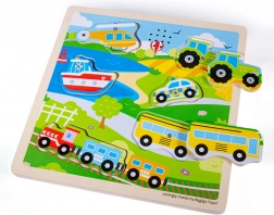 Zabavna drvena slagalica s umetanjem za djecu s motivom prijevoznih sredstava, koja nakon stavljanja dijela na pravo mjesto reproducira zvuk karakterističan za dani stroj te tako razvija dječje kognitivne vještine.