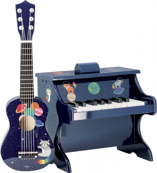 Predstavljamo Vam Svemirsku gitaru, idealan instrument za male glazbenike i ljubitelje svemirskih avantura. Ova dječja gitara izrađena je od drveta, što jamči kvalitetu i izdržljivost. Njen dizajn obogaćen je šarenim planetarnim motivima i ilustracijom rakuna astronoma, čineći je pravom igračkom iz snova.