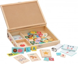 - Ploča, 2 krede, 70 drvenih pločica (slova, brojevi, znakovi), 80 kartica rječnika, 30 kartica računskih zadataka, 12 bodovnih kartica