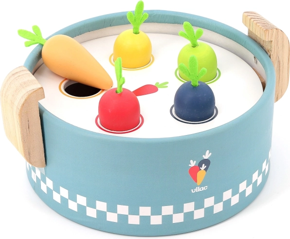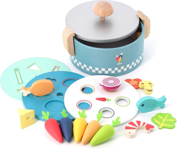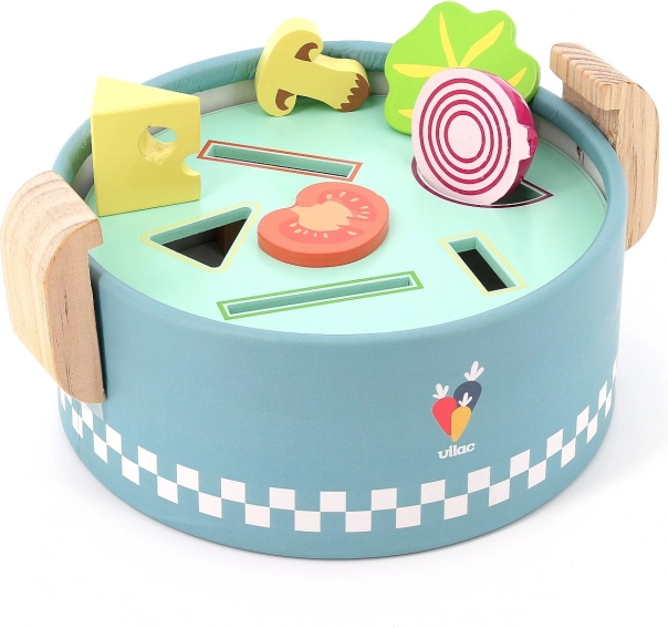 VILAC umetaljka mini lonac pametna je drvena igračka za najmlađe od 18 mjeseci. Ispod poklopca nalaze se tri izmjenjive ploče s različitim oblicima u koje djeca umeću ili ubacuju šarene komadiće namirnica. Nastaje tako „kuhanje” kao pravo, koje razvija maštu i praktične vještine.