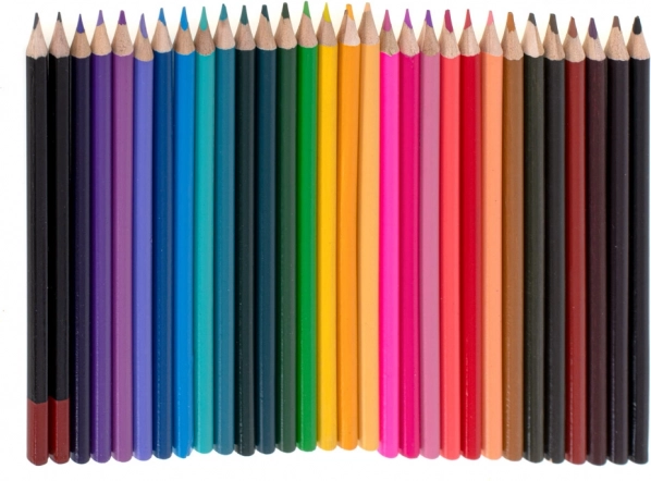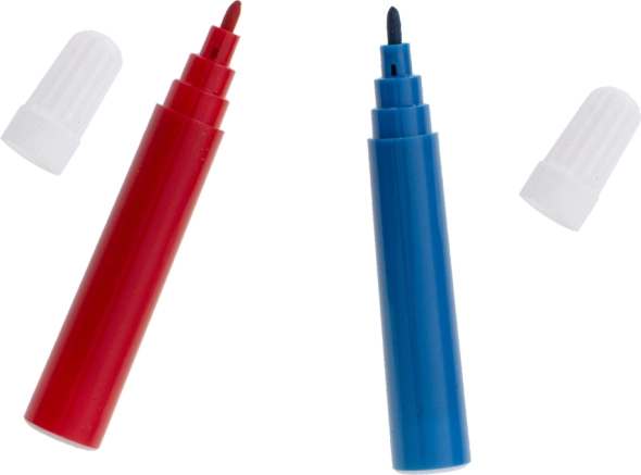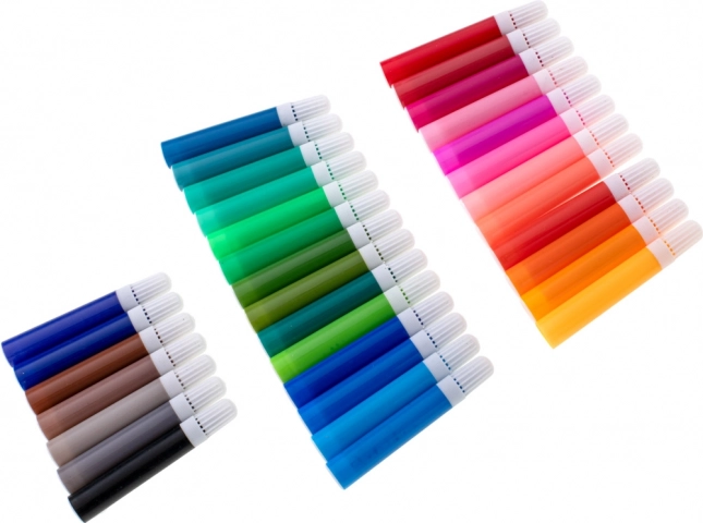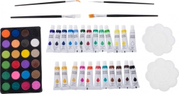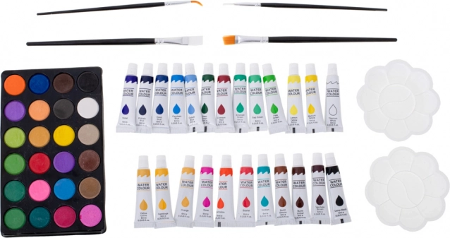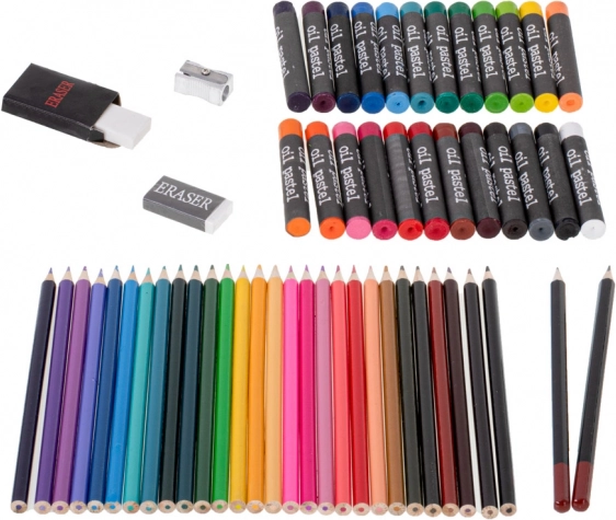 - 33× flomaster, 28× bojica, 4× kist, 2× olovka, 2× gumica, 2× plastična paleta, 1× šiljilo, paleta od 24 akvarelne boje, 24× boja u tubi, 24× uljni pastel, koferić