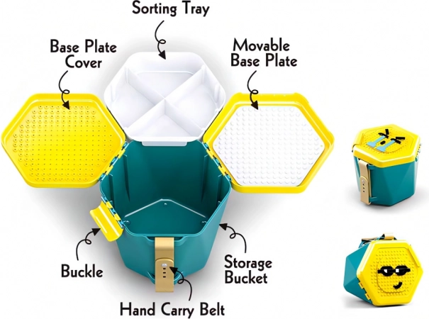 - Praktična kanta – poklopac služi kao građevna podloga, a unutra je pregrada za pregledno razvrstavanje dijelova.
