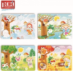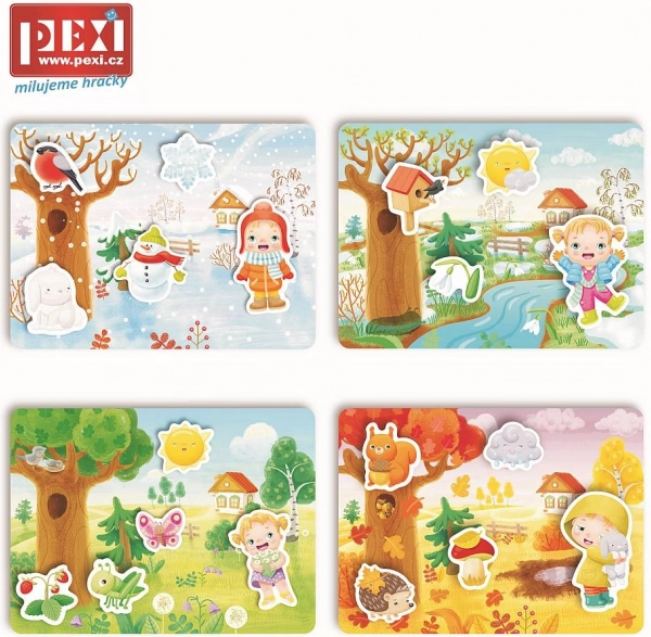 Kada radite snježne kugle? Kada možete ići u šumu brati šumsko voće i gljive? Set sadrži 4 velike elastične plastične pločice s čičkom i 20 zasebnih dijelova koje postavljate na pločice pomoću čička. Zahvaljujući ovoj praktičnoj značajci pojedini dijelovi neće tek tako spasti i ostat će na pravom mjestu.