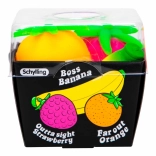 Tri voćne loptice u obliku banane, jagode i naranče u živim bojama pružaju vizualnu i taktilnu stimulaciju.