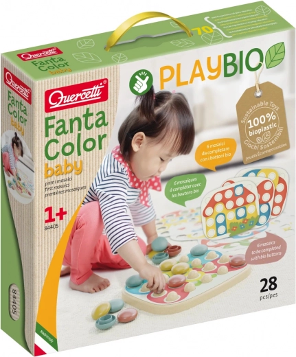 Mozaik Quercetti FantaColor Baby izrađen je od bioplastike koja sadrži drvena vlakna, što smanjuje emisije CO2 i jamči 100% recikliranje.