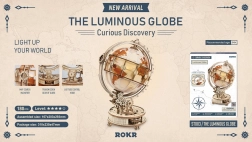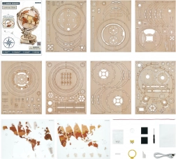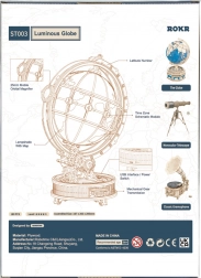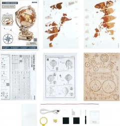 Otkrijte čaroliju svijeta s dekorativnim i funkcionalnim modelom – drvenim globusom s LED osvjetljenjem koji sastavljate sami. Zahvaljujući sustavu prijenosa globus se glatko okreće, tu je i mehanička lupa za čitanje detalja te štedljivo LED osvjetljenje napajano putem microUSB/USB-A. Slagalica od kvalitetne šperploče nudi visoku zahtjevnost, odlično provjerava strpljenje i koncentraciju, a nakon sastavljanja pretvara se u stilsku noćnu lampu u retro dizajnu.