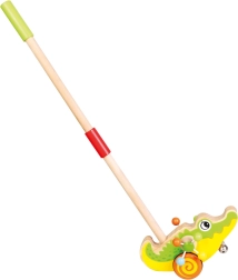 Visokokvalitetna, omiljena drvena igračka u dizajnu krokodila. Krokodil na štapu sa zvončićem, tijekom vožnje ispušta zvukove. Igračka koju dijete može gurati ispred sebe pomaže razvijati motoričke vještine. Djeca se također na ovaj način uče razlikovati boje i životinje. Guralica ima gumirana kotačića za tihi rad. Djeca je mogu gurati ili vući u kući i na otvorenom. Prekrasan poklon za vaše dijete. Glavne značajke: podržava dijete u prvim koracima, zabavna i simpatična, razvija motoričke vještine
