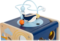 Kocka nudi interaktivne elemente poput labirinta s perlicama, kliznih zagonetki i umetanja oblika, koji potiču vještine prepoznavanja boja i oblika.