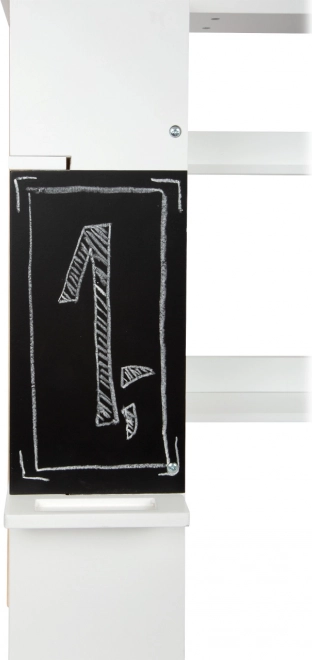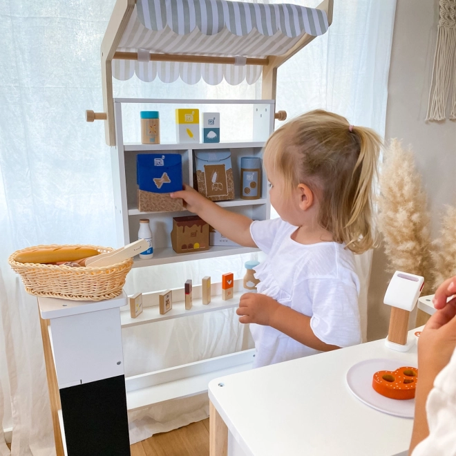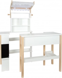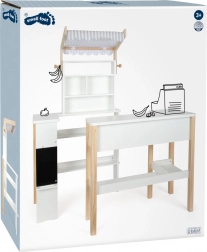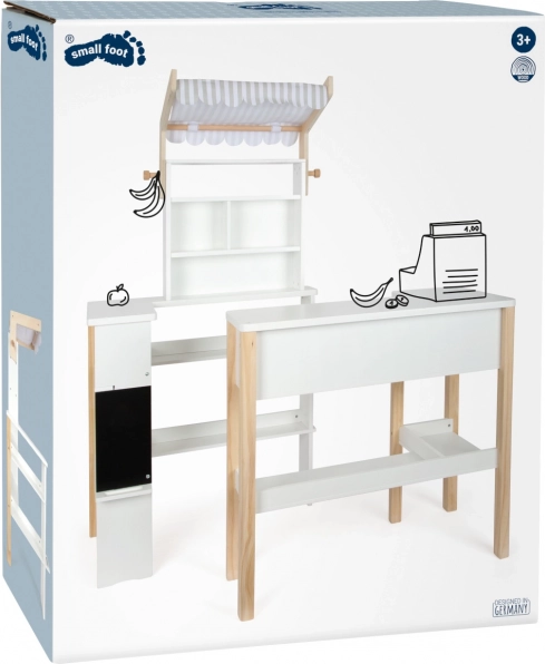 Drvena prodajna kućica SMALL FOOT Fresh pretvara dječju sobu u malo tržište. Minimalistički izgled u bijeloj i prirodnom drvu uklopit će se u svaki interijer, a odvojiva prugasta tenda daje autentičan izgled trgovine. Ploča za pisanje s policom za kredu poziva na izradu natpisa i cjenika.
