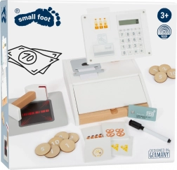 Drvena registra blagajna SMALL FOOT Fresh pretvara svaki dječji kutak u mali supermarket. Zahvaljujući integriranom kalkulatoru u okretljivom monitoru djeca lako izračunaju kupnju, otvaraju veliku ladicu s pretincima za novčiće i isprobavaju bezgotovinsko plaćanje vlastitom karticom i potpisom na pleksiglasu.