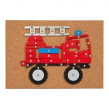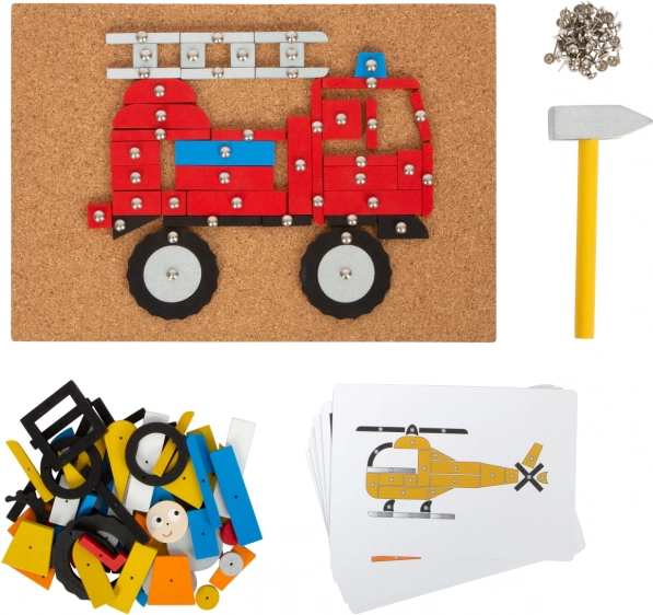 Opsežan kreativni set za igru s tematikom prometa, koji sadrži podlogu od pluta, drveni čekić i mnogo drvenih dijelova različitih oblika i boja. Pomaže razvijati kreativnost, spretnost i koordinaciju ruke i oka.