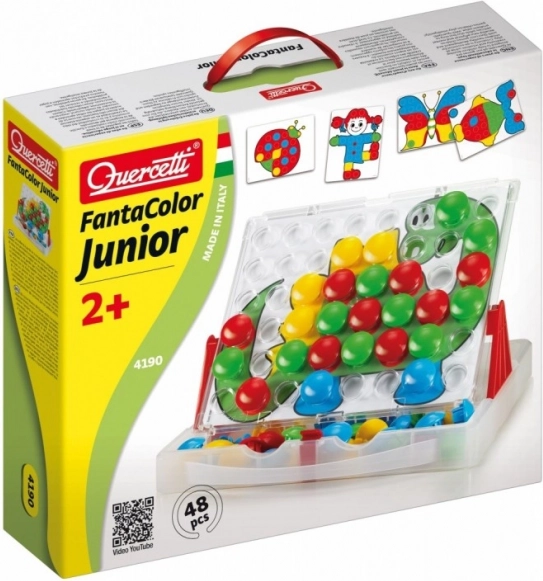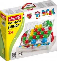 Otkrijte kreativni mozaik QUERCETTI FANTACOLOR JUNIOR koji razvija dječju maštu i finu motoriku. Zahvaljujući velikim čepovima djeca njima lako rukuju, praktični kofer drži sve na okupu, a 8 dvostranih predložaka potiče na stvaranje. Igračka podržava prepoznavanje boja, koordinciju oko–ruka, koncentraciju i strpljenje.