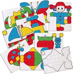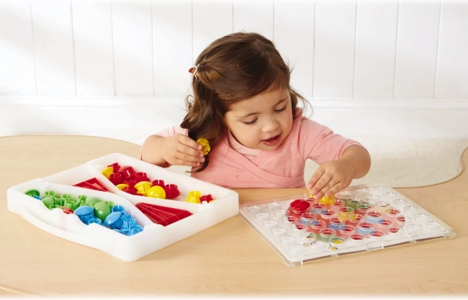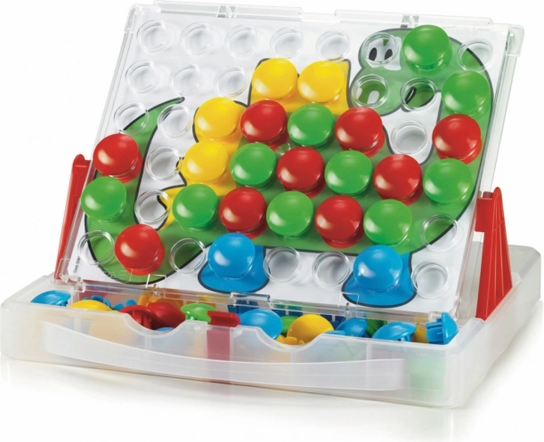 Mozaik u praktičnom koferu omogućuje djeci slaganje veselih sličica prema priloženim šablonama ili vlastitoj mašti. Ploča se može umetnuti u oslonce i koristiti u okomitom položaju za još udobnije igranje. Veliki, šareni čepovi sigurni su i lako se hvataju i za male dječje ruke.