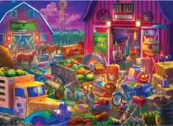 Šarena scena puna detalja – staja s natpisom For Sale, domaće životinje, stari kamion s urodom i sezonski ukrasi. Idealno za ljubitelje seoskih motiva i razrađenih ilustracija.