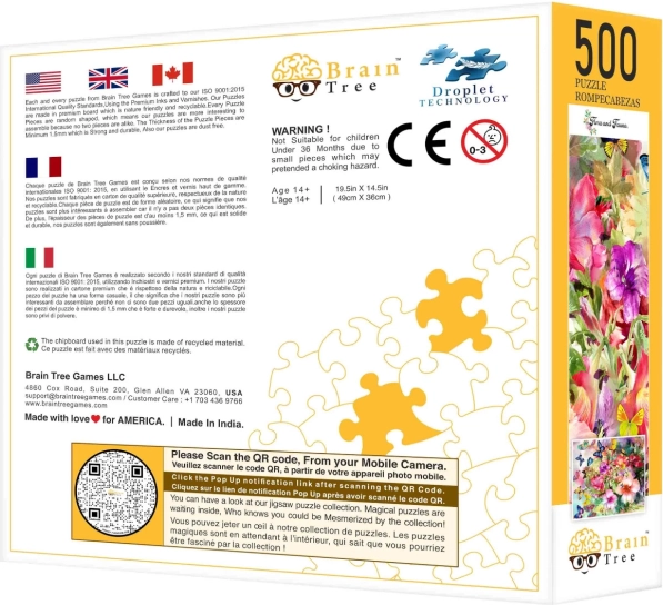 Slagalica iz linije Brain Tree oduševit će vas svojim atraktivnim dizajnom koji spaja ljepotu cvijeća i leptira. Zahvaljujući nasumično rezanim dijelovima, u slaganju ćete otkriti novu dimenziju avanture. Ponuđeni praktični dodaci, poput papirnatog stalka i kartonskih pregrada, čine iskustvo slaganja još udobnijim. Osim toga, pakiranje sadrži poster formata 52×30 cm koji služi kao predložak pri slaganju. Uživajte u zabavi s obitelji ili u mirnoj večeri nasamo.