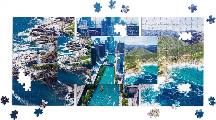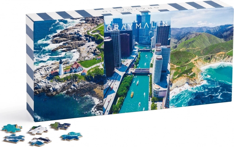 Ova ekskluzivna kolekcija uključuje tri zasebne slagalice s ikoničnim prizorima Mainea, Chicaga i Big Sura, koje nose prepoznatljiv potpis fotografa Gray Malin. Svaka slagalica pakirana je zasebno u atraktivnoj kutiji, pa ih možete darivati postupno ili uživati u cijelom setu.
