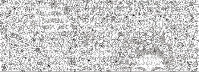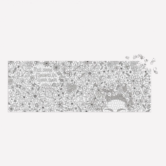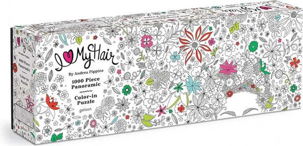 Panoramske puzzle I Love My Hair spajaju radost slaganja s kreativnošću bojanja. Crno-bijeli motiv s cvijećem i frizerskim ornamentima izravno poziva na izražavanje vlastite mašte – bojice ili flomasteri pretvorit će sliku u vašu jedinstvenu dekoraciju.