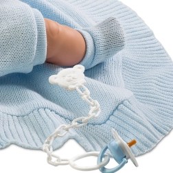 Beba NEW BORN JOEL LLORÓN veličine 38 cm izrađena je s naglaskom na detalje – nježne crte lica, mekane tkanine i udobno odijevanje. Nakon vađenja dudice čuje se “mama”, “tata” i vjerni zvuk plača bebe, koji lako umirite ponovnim stavljanjem dudice.