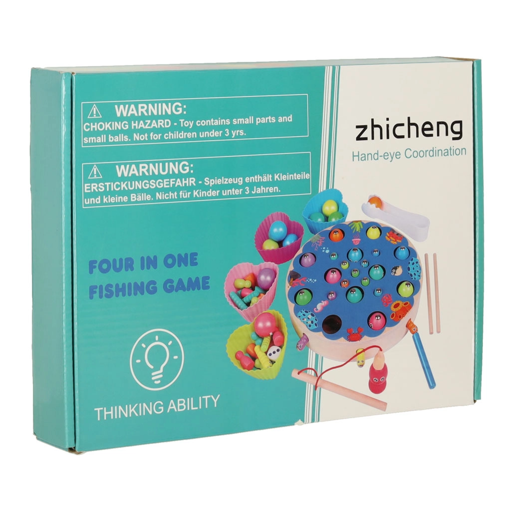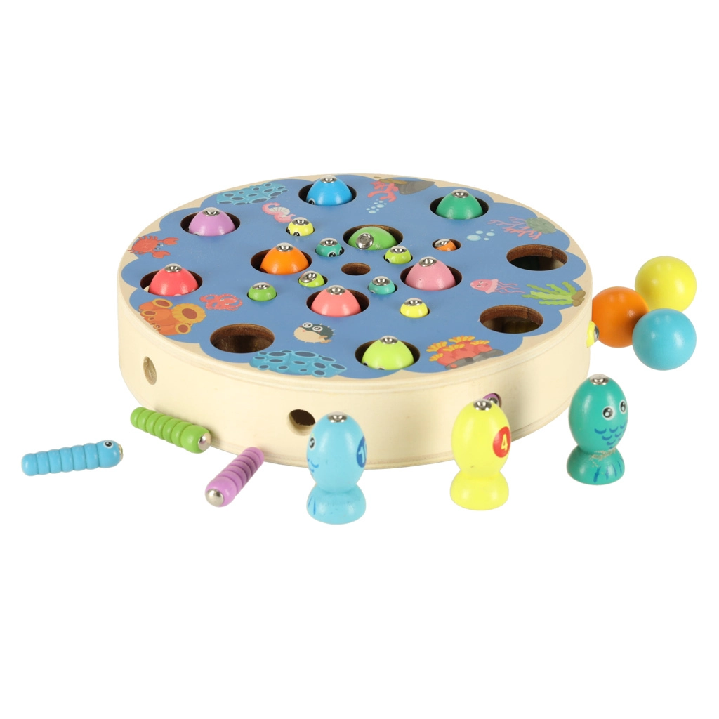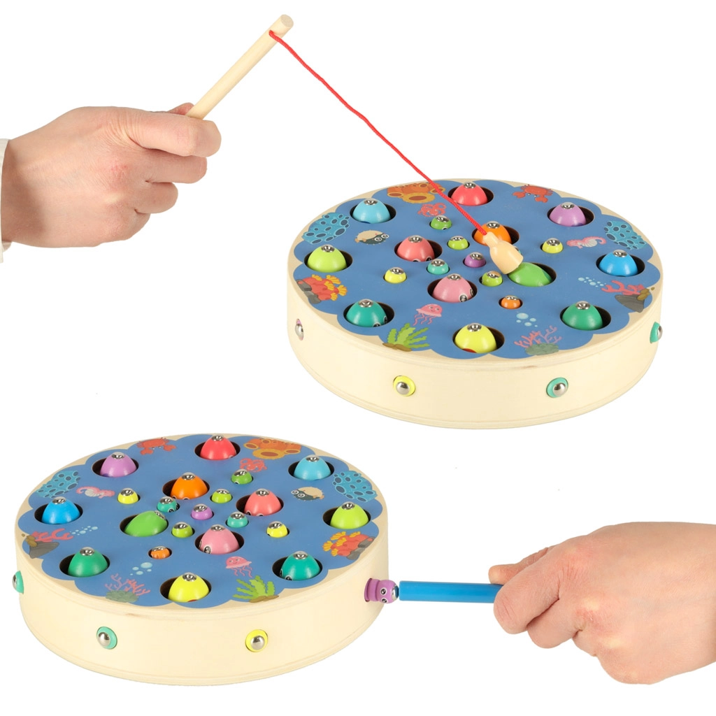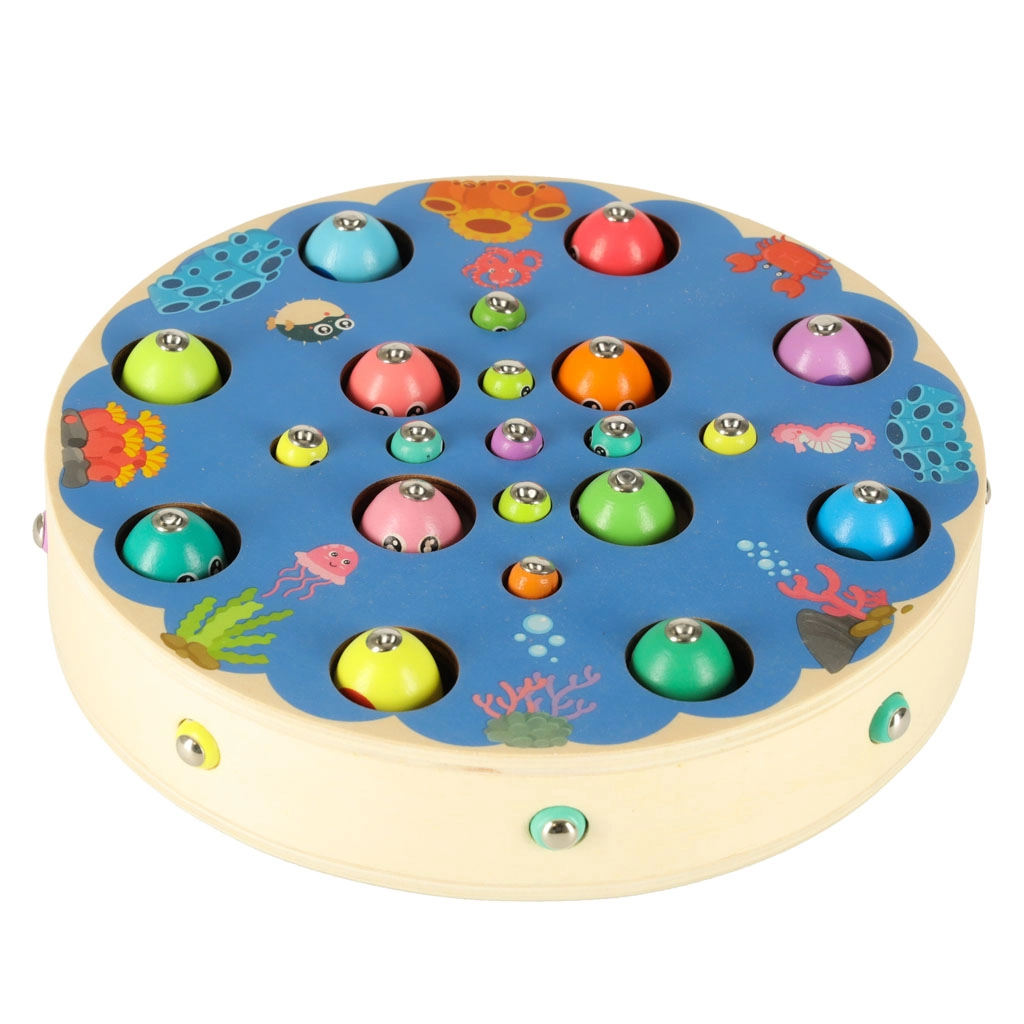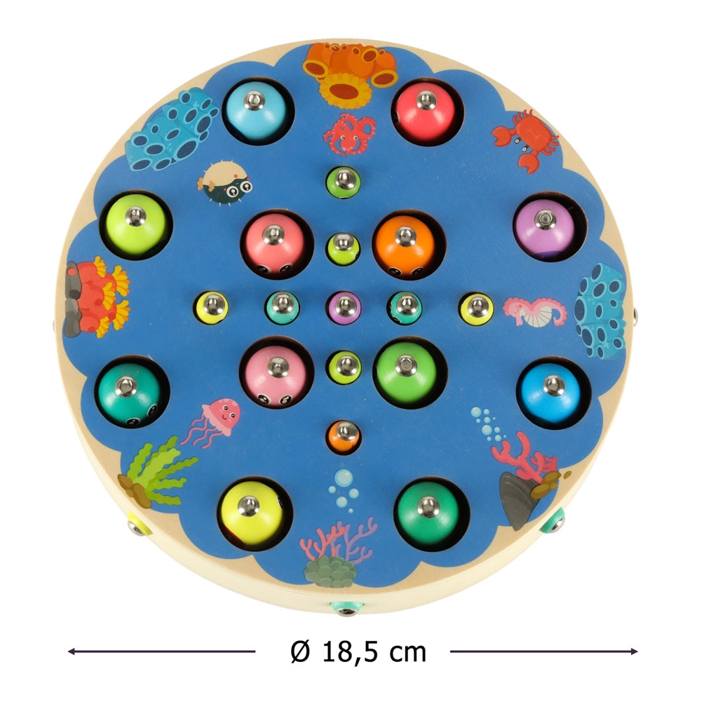 Multifunkcionalni montessori set donosi djeci sate kreativne zabave i učenja. Na okrugloj drvenoj podlozi s oceanskim motivom djeca love magnetne ribice štapovima, izvlače gusjenice, prenose kuglice pomoću pincete ili štapića te uvježbavaju boje, sortiranje i strpljenje. Zahvaljujući bogatoj opremi mogu se igrati i u više djece.