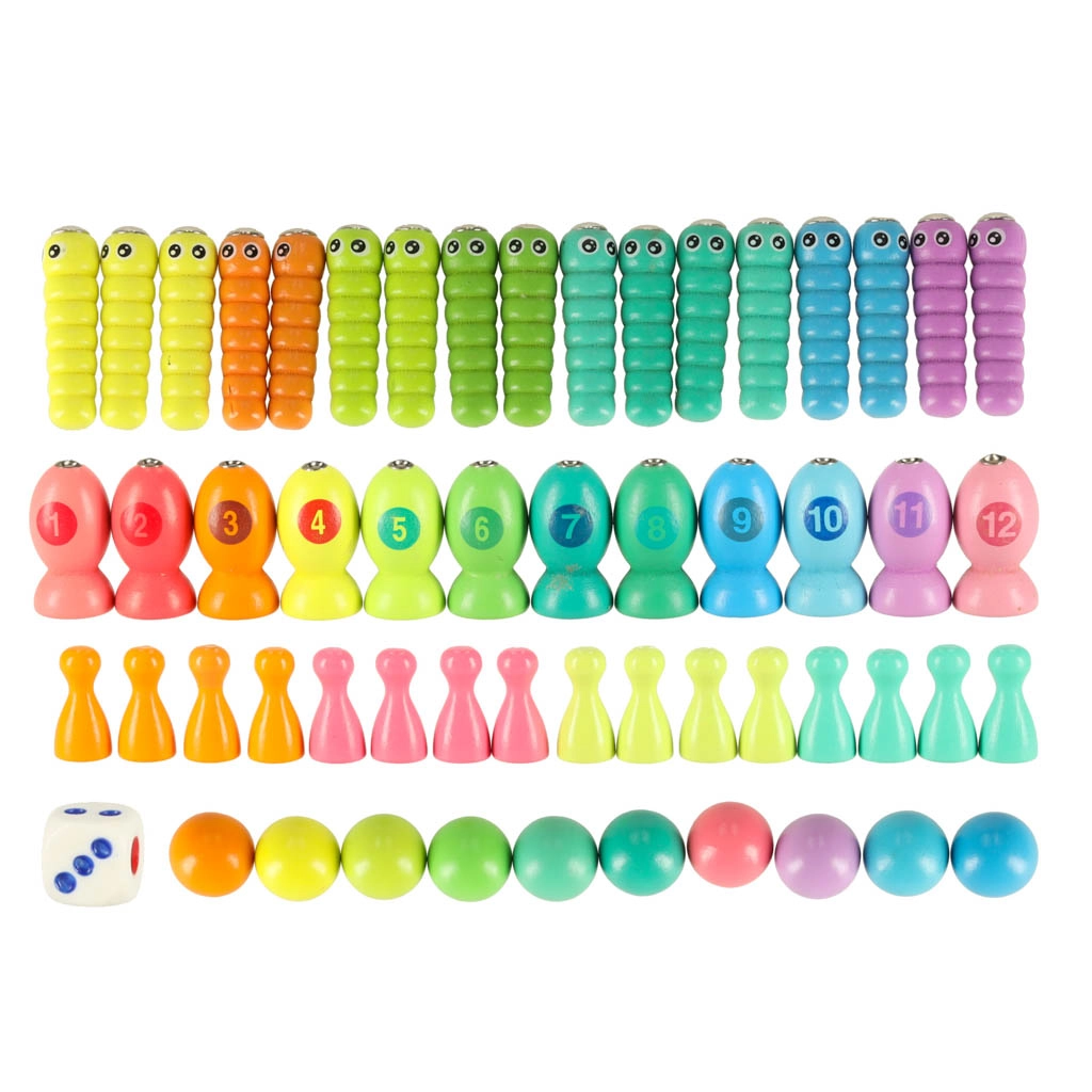 - 1× drvena podloga, 2× štap, 2× štapići, 1× pinceta, 4× silikonska zdjelica, 10× drvena kuglica, 12× ribica, 17× gusjenica, 16× pješak u 4 boje, 1× kocka