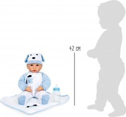 Lutka Beno idealan je pratitelj za svu djecu koja vole pse. Ova realistična lutka odjevena je u slatku plavo-bijelu odjeću s motivom štencića te dolazi s bočicom za bebe i dudu varalicom.