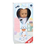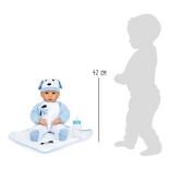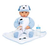 Lutka je odjevena u slatku plavo-bijelu odjeću koja oponaša stvarnu dječju odjeću.