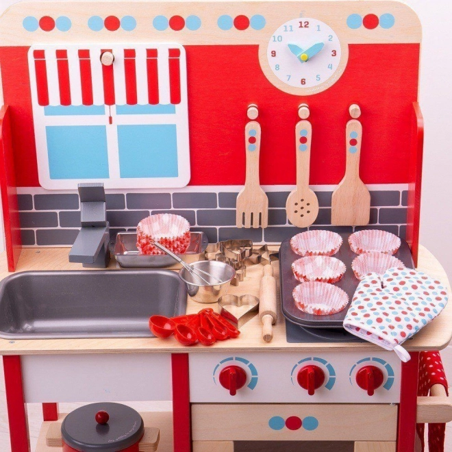 Ovaj sveobuhvatni set za pečenje sadrži svu opremu koju svaki mali kuhar treba za svoje prve pokušaje pečenja. Uključuje lim za pečenje, rukavicu, kalup za kruh, pjenjaču, drveni valjak, zdjelu, set mjernih žlica i šest kalupa za kekse.