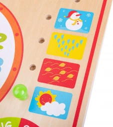 Ploča je pregledna, sadrži veliki sat s pomičnim kazaljkama, okretne ili klizne pokazivače za dane, mjesece, vrijeme i godišnja doba. Osnovni natpisi su na engleskom, pa dijete prirodno stječe i jezični doprinos. Proizvod je izrađen od izdržljivog, odgovorno dobivenog drva i prikladan je za svakodnevnu kućnu i vrtićku uporabu.
