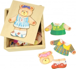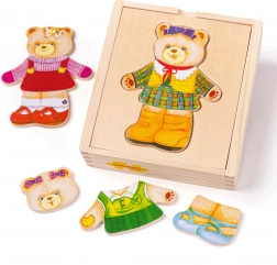 Preslatka drvena oblačilna slagalica za najmlađe pomaže djeci kombinirati odjeću i izraze lica medvjedice. Sadrži 18 dijelova, praktičnu kutijicu s poklopcem–pločom i potiče finu motoriku, koordinaciju oko–ruka te rječnik. Izrađeno od kvalitetnog drva, sigurno od 3 godine i u skladu s europskim sigurnosnim normama.
