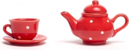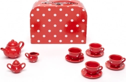 Priredite savršeni dječji čajni party s ovim čarobnim setom u crvenoj boji s bijelim točkama. Set sadrži sve što mali domaćini trebaju – čajnik, 4 šalice s tanjurićima, šećernicu i vrčić za mlijeko. Sve se nakon igre lako pospremi u čvrsti koferčić, pa je set idealan i za putovanja. Proizvedeno od kvalitetnih materijala i u skladu s europskim sigurnosnim normama.