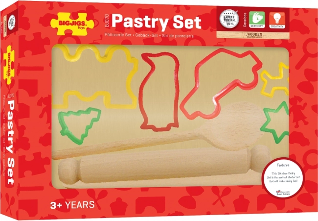Otkrijte zabavu pečenja s dječjim setom BIGJIGS – praktičan i siguran komplet za prve kulinarske korake. Set uključuje drveni valjak, dasku, kuhaču, špatulu i 6 šarenih kalupa za izrezivanje (zvijezda, auto, pas, božićno drvce, vlakić, pingvin). 10-dijelni set potiče kreativnost i finu motoriku, prikladan je od 3 godine i udovoljava važećim europskim sigurnosnim normama.