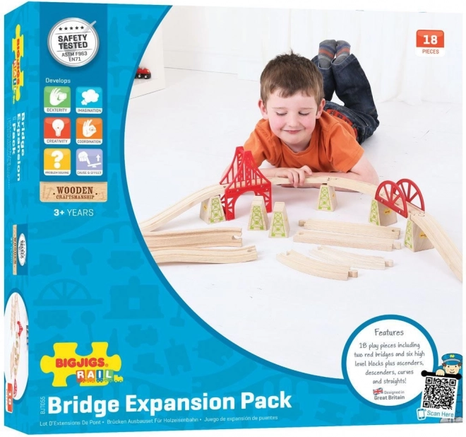 Proširite svoju drvenu željezničku prugu univerzalnim mostnim setom s 18 dijelova koji igri dodaje nove visine i avanture. Set uključuje uzlazne i silazne tračnice, potpore i mostne elemente za lako savladavanje prepreka. U potpunosti je kompatibilan s većinom drvenih željezničkih pruga i izrađen od kvalitetnog drva. Kompatibilnost, kvalitetni materijali, sigurna igra i razvoj mašte i fine motorike.