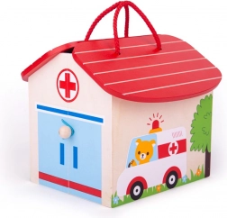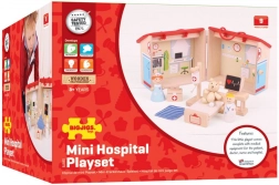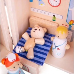 Ovaj kompaktan i prijenosan igrani set Medvjedića bolnica idealan je za male liječnike. Drvena konstrukcija je izdržljiva i izrađena od materijala visoke kvalitete koji zadovoljavaju sve europske sigurnosne norme. Igračka sadrži devet elemenata koji djeci omogućuju stvaranje različitih scenarija i situacija.
