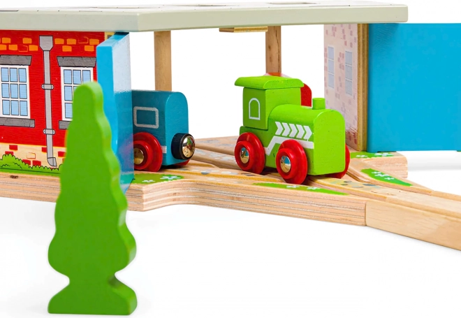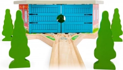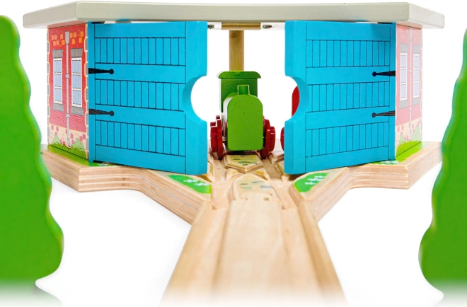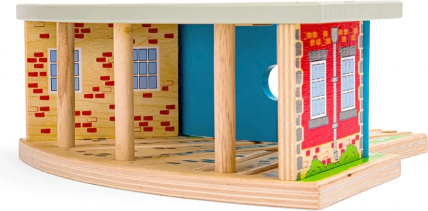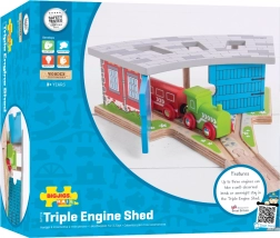 Trostruko spremište s vratima idealan je dodatak za svakog malog strojovođu. Zahvaljujući trima stajalištima i integriranom povezivanju tračnica lako ćete organizirati promet na pruzi i odložiti vlakove nakon dana punog vožnje. Čvrsta drvena konstrukcija s kolorističkim detaljima djeluje realistično i podnosi i intenzivnu igru.