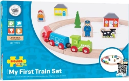 - 8× drvene tračnice, 1× lokomotiva, 2× vagon s magnetnim spojnicama, 8× dodaci (kuće, stabla, figure)