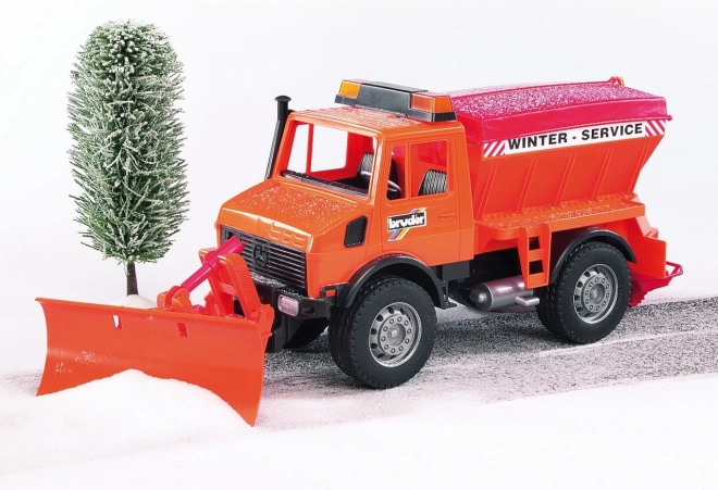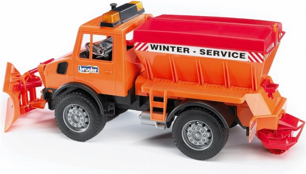 Mercedes-Benz Unimog marke BRUDER je robustan posipač s ralicom namijenjen zimskim poslovima. Zahvaljujući preciznoj izradi djeci pruža realističnu igru – od čišćenja snijega do posipanja kolnika. Prednja zglobna os osigurava izvrsnu upravljivost, a ralica je ne samo okretljiva nego i lako odvojiva.