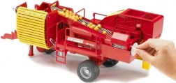 Ovaj veliki i detaljno razrađeni model kombajna za krumpire uključuje značajne funkcionalne dijelove poput prebirnog pojasa koji se lako upravlja pomoću ručne ručice. Krumpiri se transportiraju s pojasa izravno u spremnik koji je moguće podesiti prema želji.