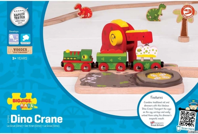 Dinosaurova dizalica Bigjigs Rail donosi dozu avanture na vašu drvenu željezničku prugu. Djeca pomoću pokretnog dinosaurovog vrata i magneta premještaju dinosaurovo jaje na priloženi vagončić i vježbaju koordinaciju ruka–oko. Šareni dizajn i čvrsta drvena konstrukcija potiču maštovitu igru koja traje.