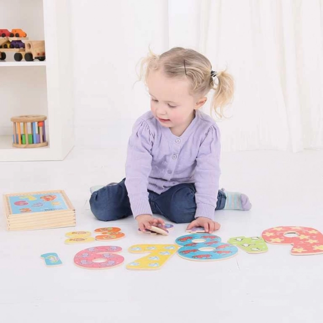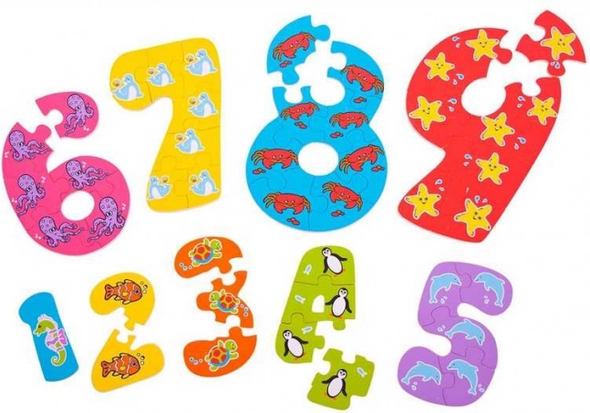 Ovaj set edukativnih slagalica uči djecu prepoznavati znamenke i pridruživati im količinu. Svaki se broj sastoji od odgovarajućeg broja dijelova (npr. broj 4 ima četiri dijela) s veselim životinjskim motivom, što potiče prirodno učenje i radost slaganja.