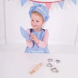 Mali kuhari će obožavati ovaj svijetli i ugodni plavi pamučni set za pečenje i kuhanje. Sadrži pregaču, rukavicu, kuharsku kapu, valjak i kalupe, idealno za zabavno kuhanje i igre uloga.