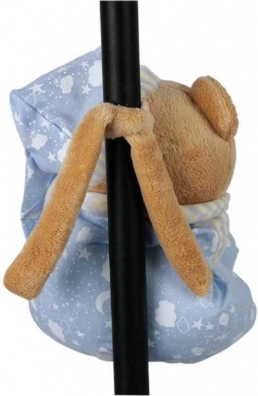 Medvjedić ima plavu pidžamu s uzorkom zvjezdica i mjeseca, što stvara umirujući dojam i predstavlja idealnog saputnika za dječju sobu.