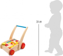 Otkrijte idealno pomagalo za prve korake – drvenu hodalicu s kolicima punim raznobojnih kocaka. Robusna konstrukcija od punog drva i šperploče pruža stabilnost, dok bukove kocke različitih oblika (cca 5–10 cm) potiču kreativnu igru. Zahvaljujući udobnoj ručki na visini od 39 cm djeca se osjećaju sigurno i samouvjereno.