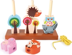 Ovaj kvalitetni drveni set spaja slaganje i provlačenje u jednu pametnu igru. Djeca mogu posložiti ježa, lisicu, vjevericu, rakuna i sovu na postolje s tri klipića ili ih nizati na priloženu uzicu. Dijelovi su robusni, dobro leže u dječjoj ruci i svojim bojama potiču maštu.