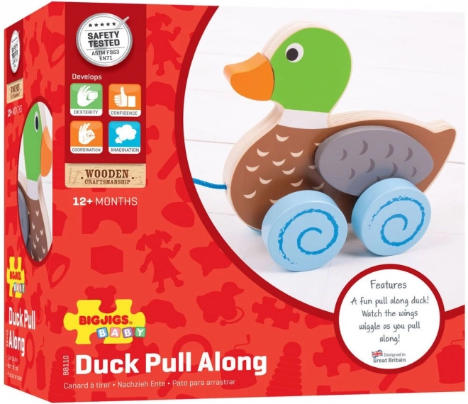 Ova klasična vučna patkica poziva djecu na aktivnu igru i prve šetnje. Zahvaljujući stabilnim kotačićima i glatkom kretanju lako se vodi pomoću uzice, dok krila tijekom vožnje veselo mašu. Kombinacija privlačnih boja i ugodne drvene izrade prirodno potiče znatiželju i samostalno kretanje.