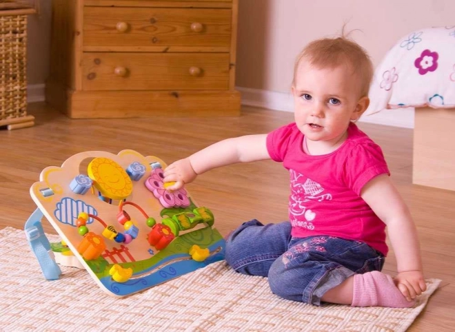 Otkrijte razigranu motoričku ploču za najmlađe koja razvija finu motoriku, senzornu percepciju i koordinaciju oko–ruka. Šareni elementi poput rotirajućeg labirinta, bubamara, truta i leptira na koraljkastom labirintu te kliznih pačića zabavit će djecu i podržati njihov razvoj vještina. Ploča se zahvaljujući podesivim nosačima može pričvrstiti i na krevetić. Izrađena od kvalitetnih, odgovorno dobivenih materijala, ispunjava europske sigurnosne norme. Prikladno od 6 mjeseci.