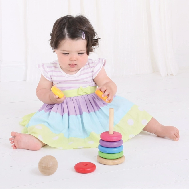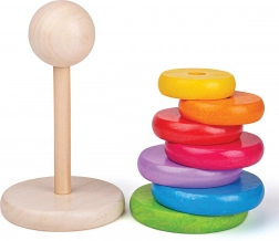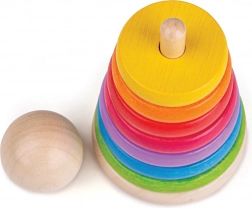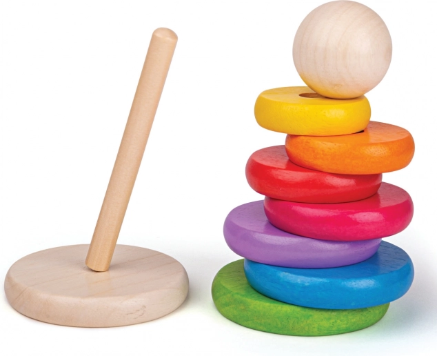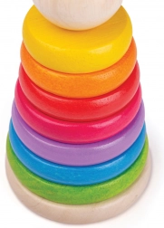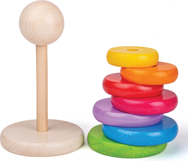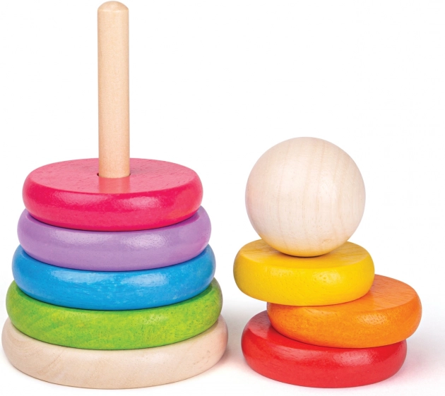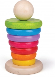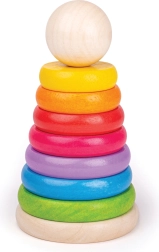Ovaj drveni stogasti pajac idealna je igračka za razvoj fine motorike te koordinacije ruku i očiju. Slaganje prstenova po veličini ne samo da zabavlja, već i uči djecu razlikovati veličine i boje.
